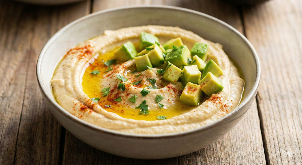 1. طريقة عمل طبق حمص بالثوم والليمون والأفوكادو